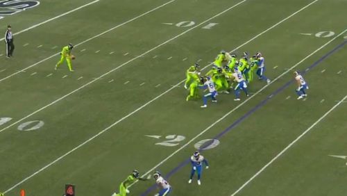 The DOUBLE PUNT in which the Seattle Seahawks Michael Dickson had a kick blocked and. The Seahawks did a double punt and it counted. It was a 68-yarder that rolled all the way down to the Rams 11-yard line.